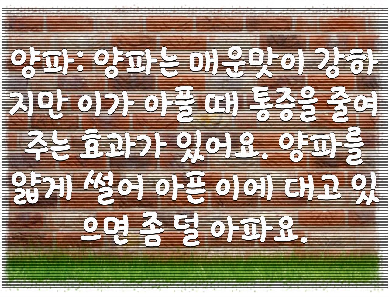 양파: 양파는 매운맛이 강하지만 이가 아플 때 통증을 줄여주는 효과가 있어요. 양파를 얇게 썰어 아픈 이에 대고 있으면 좀 덜 아파요.