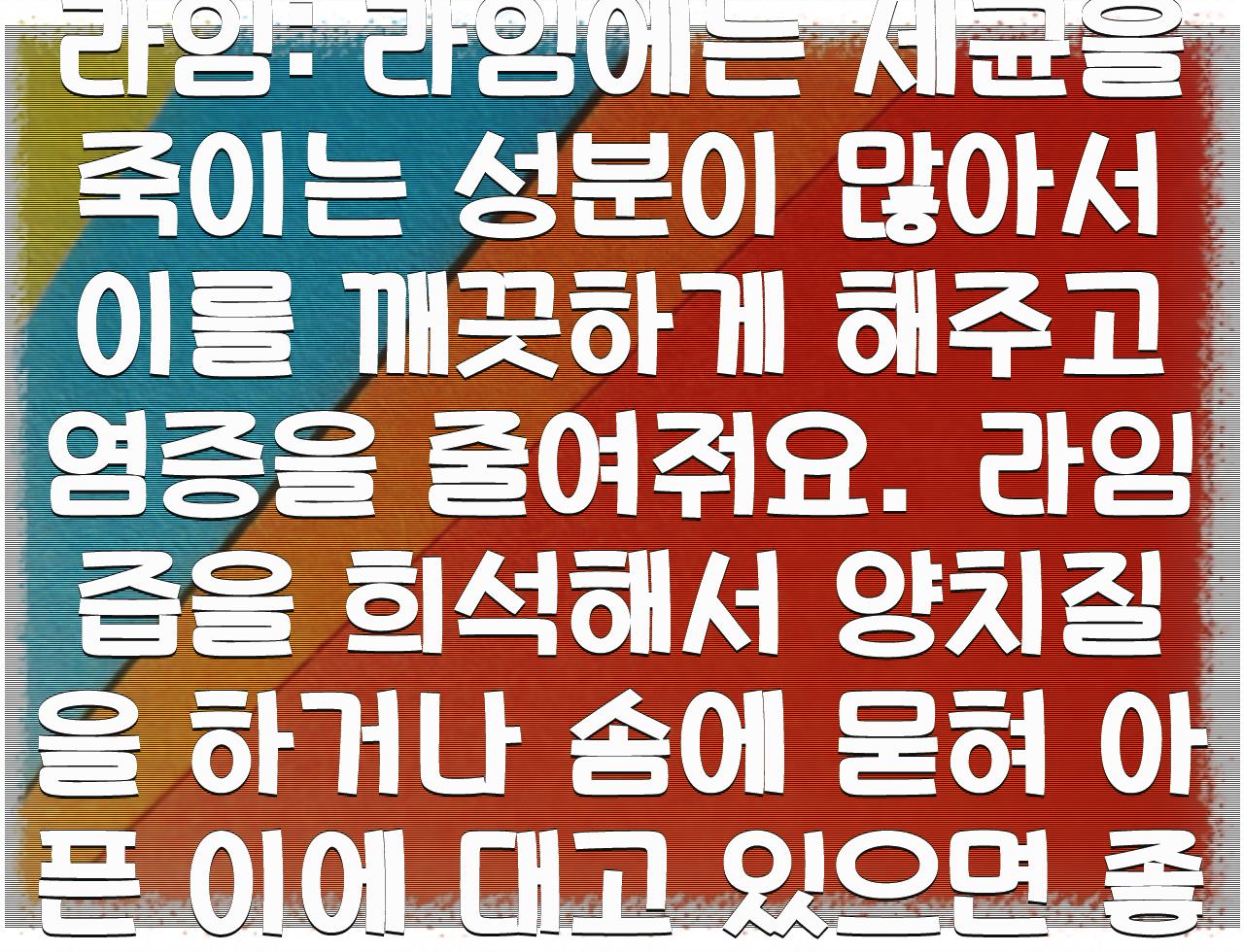 라임: 라임에는 세균을 죽이는 성분이 많아서 이를 깨끗하게 해주고 염증을 줄여줘요. 라임즙을 희석해서 양치질을 하거나 솜에 묻혀 아픈 이에 대고 있으면 좋아요.